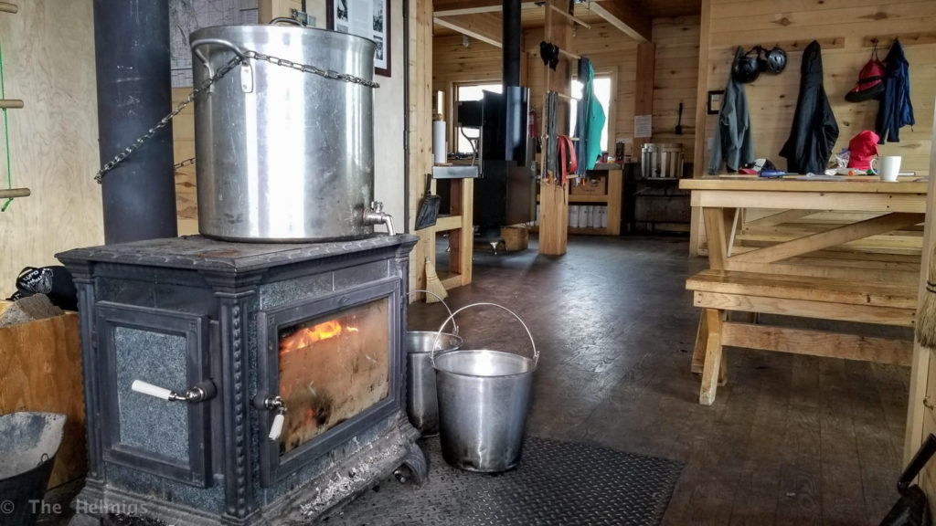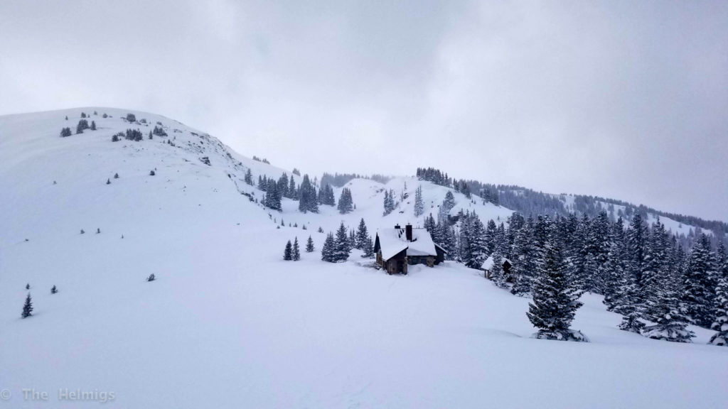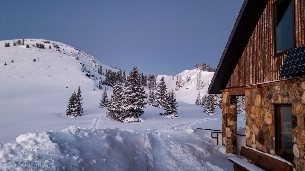 Thursday morning we awoke with 3-4″ of fresh snow, and a bit of wind accompanying to fill in the tracks from previous days. The other hut users left around 8am, leaving us with the hut to ourselves! Peace and quiet, and doing all the chores the 9 other folks should have helped with before heading out… like sweeping, restocking snow-melt water, cleaning counters/dishes, etc.