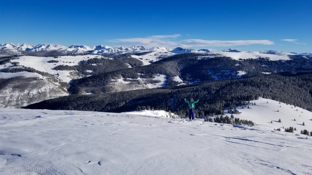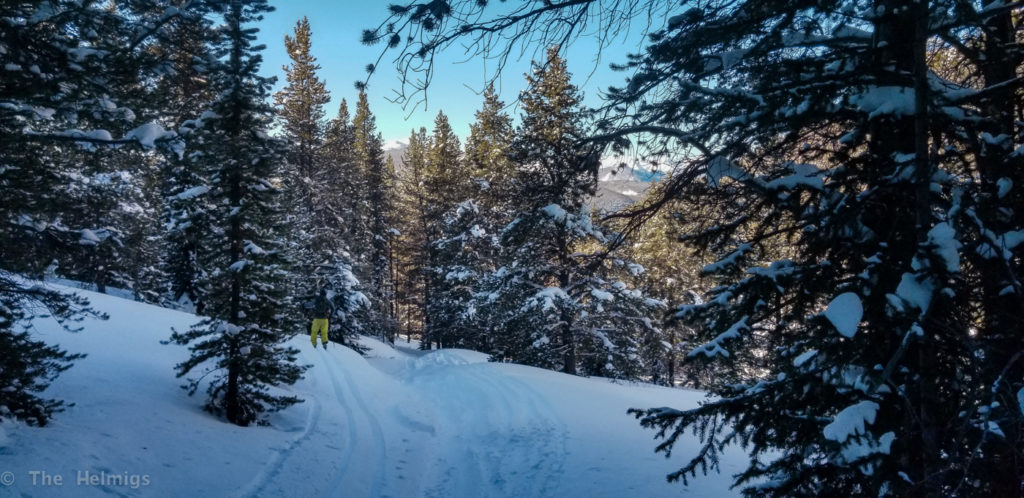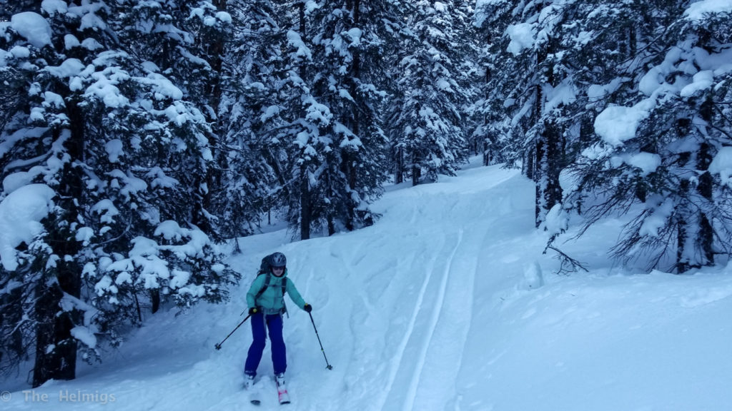 The next morning we packed up, did our share of hut chores and set off for the van. Being a beautiful bluebird day, we opted to head straight up Resolution Mountain and skied off the top back down McAllister Gulch. Since we are new on skis (we have been splitboarding for years, but decided to switch), we had an interesting trip back down the narrow, steep track. All in all, it went pretty well with minimal crashes! The fresh snow really helped slow us down when needed (and cushion falls..).