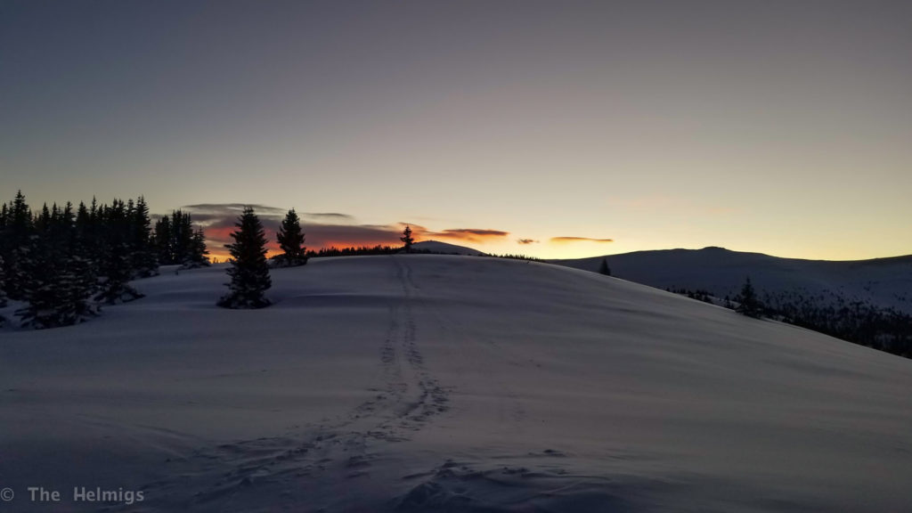 The next 2-3mi were a breeze, with 3″ of fresh snow on some previous skin tracks. The trail was easy to follow with blue diamonds on the trees, using a 4×4 summer road cut through the forest. The last mile or so turned steep, with 30lb packs and fresh snow it was slow going!