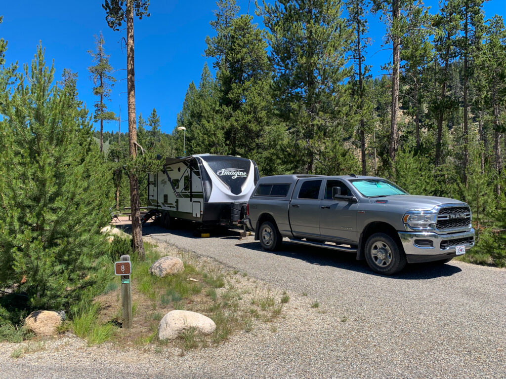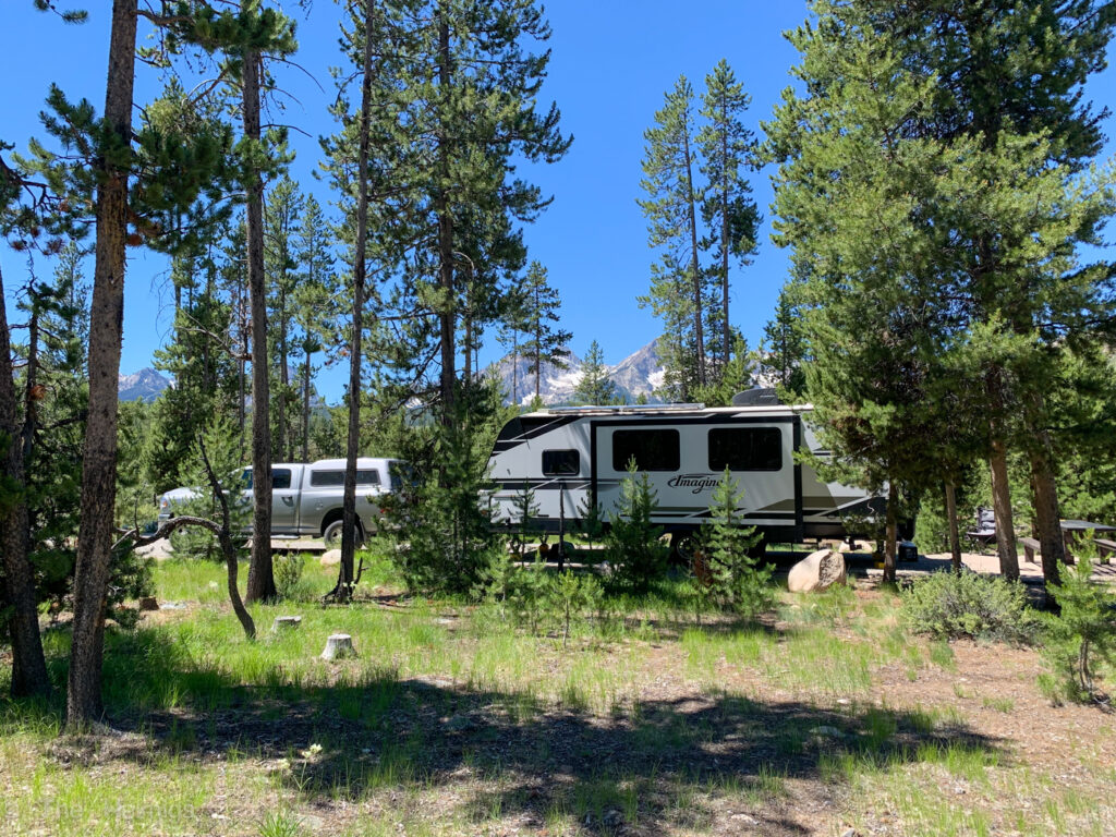 We were bummed to be leaving Sun Valley after 7 days, but it was time to move on. We made the one hour or so drive north to Stanley, Idaho. With lots of first come, first serve campgrounds and dispersed camping in the area, we chose to not make any reservations for our stay in Stanley (a rarity for us!). We found a great site at the Sunny Gulch Campground. Getting to the campground on a Monday in the late morning definitely helped us get a good site. The views from camp of the Sawtooths were stunning to say the least! Plus, it was right on the Salmon River. We even had some cell service, which wasn’t possible at the majority of the campgrounds in the area.