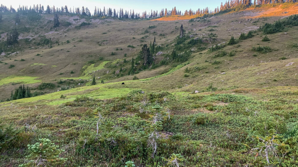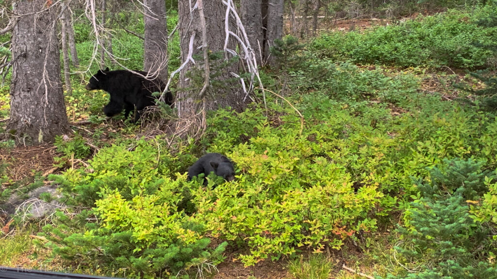 So this loop is well known for bear activity. As it turned out, we both saw black bears on our hike. Mine (Kyle’s) experience was pretty intense. I just got to the top of an exposed ridge climb and was cooling off in the shade. My shirt was off, my pack was on the ground and I was enjoying the breeze when I hear some rustling in the woods behind me. I duck out to see what it was as it sounded like it skirted back towards the trail. Sure enough, this fine black bear emerged about 10-15 yards away from me eating blueberries. I quickly grabbed my bear spray and stood tense for a few minutes before determining the bear could care less about me – the berries were very plentiful! I put my gear back together and my shirt back on and started walking around to the left to continue down the trail. The bear took that opportunity to slip back into the woods to give me space as well. All in all, seeing a bear that close in the wild was a great – if tense – experience.