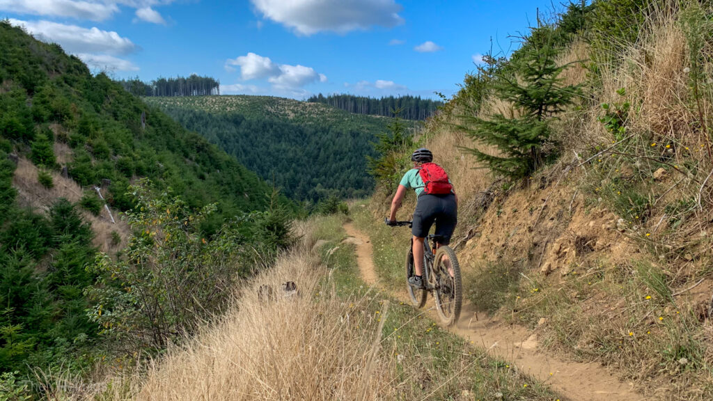 The Alsea trail system is unbelievable. The climb to the top is a dirt road with a moderate grade; it goes by fast.