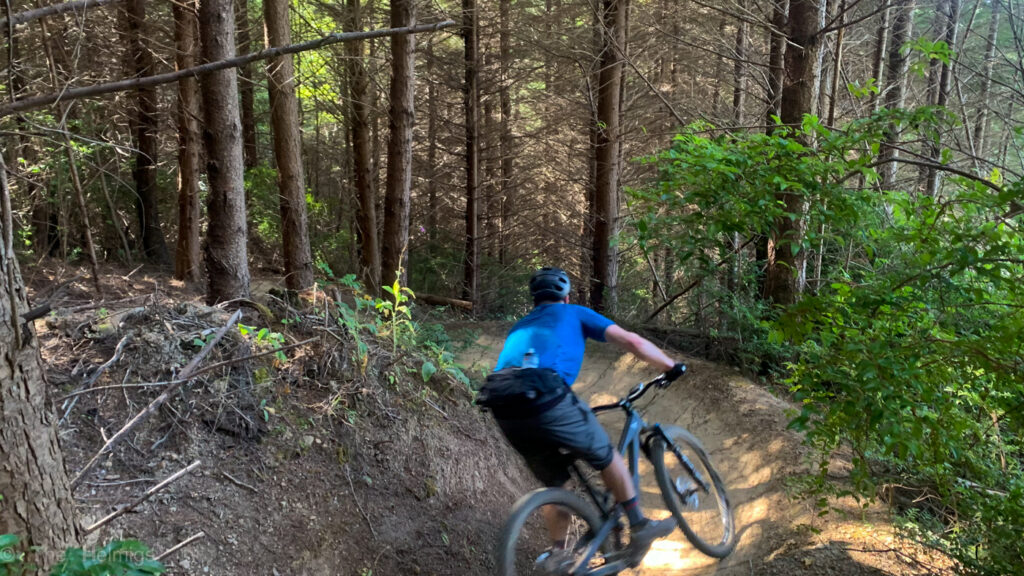 The downhill is built so well and it really maximizes the drop in elevation. The dirt is bright red in some sections, so that there is a beautiful contrast between the trees, the foilage, and the dirt. I feel like I have mountain biked many trails across the US, and I’d argue that this is the best mountain biking trail in the entire US.